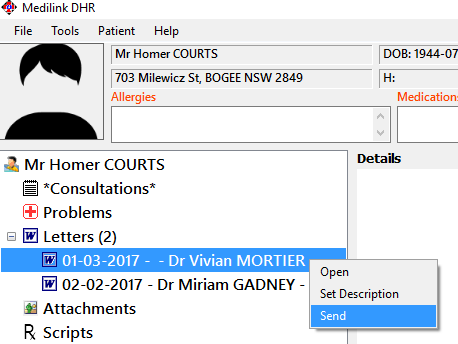 Highlight the Patient Letter you want to send and right click and choose Send.